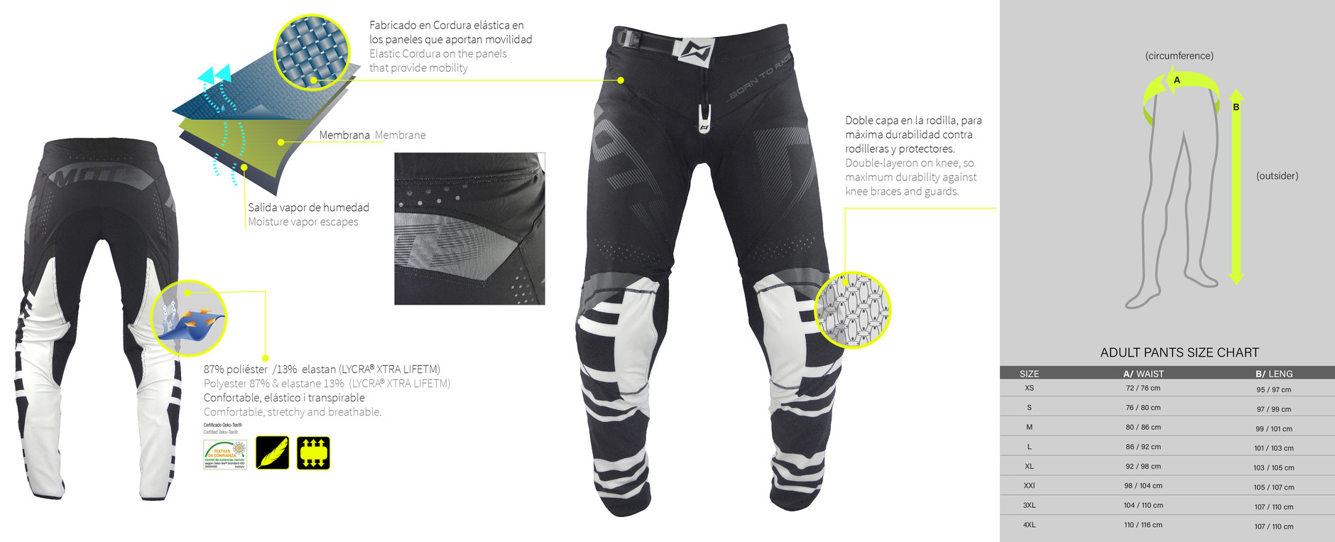 Fabricado en Cordura elástica en los paneles que aportan movilidad y Poliéster / Elastómero en los paneles con menor fricción, aumentando así el confort, la elasticidad y la transpirabilidad.